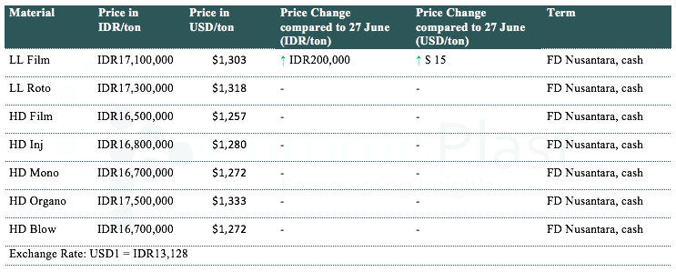 A major producer in Indonesia has increased IDR200,000/t ($15/t) for LLDPE and maintaining stable offers for other PE grades compared to end of last month. The latest price levels of the producer are shown in the following table: