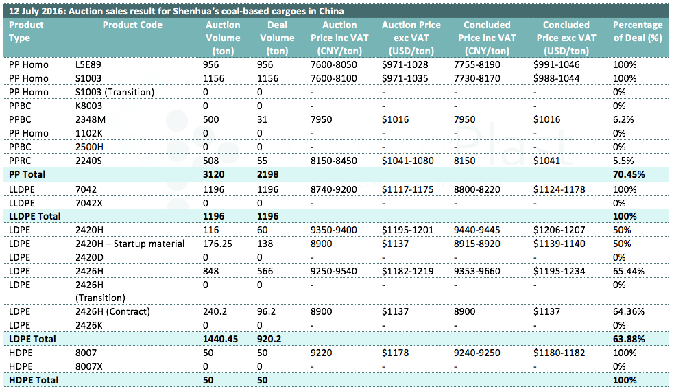 Auctions sales result for Shenhua’s coal-based polyolefin products in domestic China are as following: