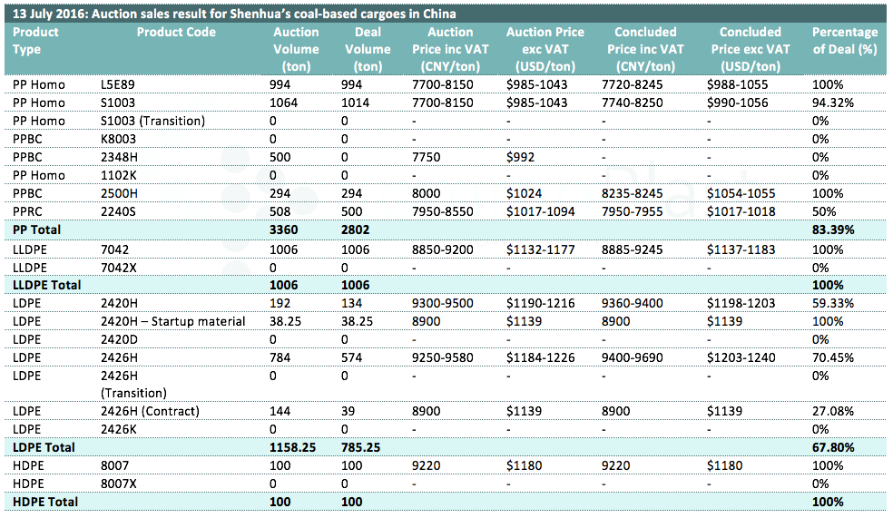 13 July 2016: Auction sales result for Shenhua's coal-based cargoes in China