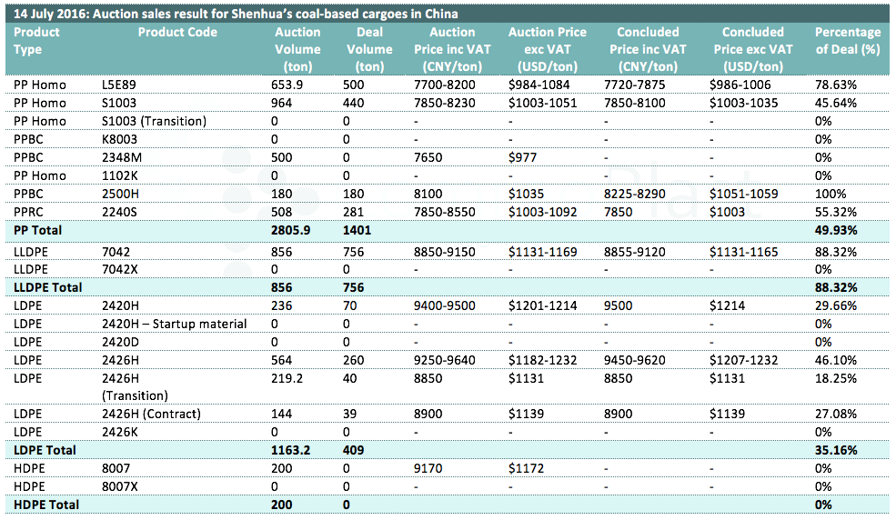 14 July 2016: Auction sales result for Shenhua's coal-based cargoes in China