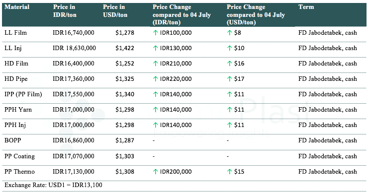 A major maker in Indonesia has announced their fresh offers today with an increased of IDR100,000-130,000/t ($8-10/t) for LLDPE, IDR210,000-220,000/t ($16-17/t) for HDPE, IDR140,000-200,000/t ($11-15/t) for PP except BOPP and homo-PP coating remain stable compared to last week.