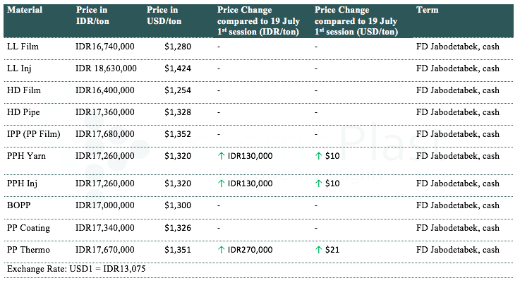 On the second session of the price announcement of the day, a major maker in Indonesia has lifted their PP offers with an increased of IDR130,000/t ($10/t) for homo-PP raffia and injection, and IDR270,000/t ($21/t) for thermoforming PP compared to their initial offers this morning.