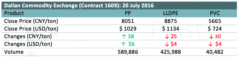 Contract number 1609 on Dalian Commodity Exchange on 20 July 2016 settled as following:
