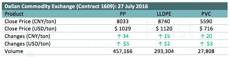 Contract number 1609 on Dalian Commodity Exchange on 27 July 2016 settled as following: