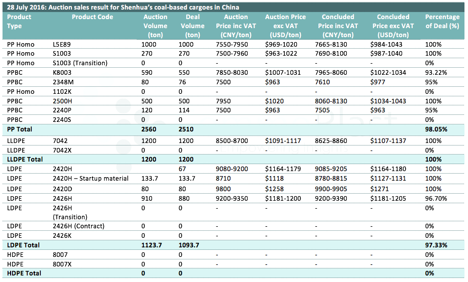 28 July 2016: Auction sales result for Shenhua's coal-based cargoes in China