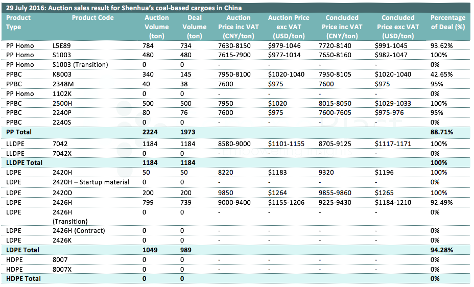 29 July 2016: Auction sales result for Shenhua's coal-based cargoes in China