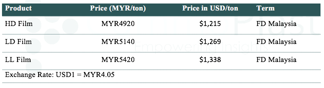 Market players reported that another major producer in Malaysia has announced new offers last Friday (29 July 2016) for August delivery with increased of MYR70/t ($17/t) for PE grades. The latest price list is shown in the following table: