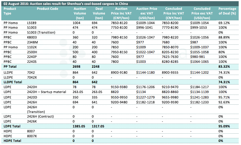 02 August 2016: Auction sales result for Shenhua's coal-based cargoes in China