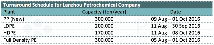 According to market sources, Lanzhou Petrochemical Company is planning to conduct major maintenance work at its Lanzhou based polyolefins plant starting next week. Detail on the shutdown is shown in the following table: