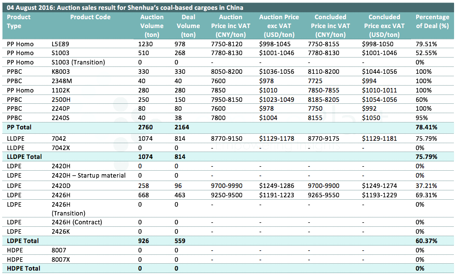 04 August 2016: Auction sales result for Shenhua's coal-based cargoes in China