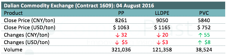 Contract number 1609 on Dalian Commodity Exchange on 04 August 2016 settled as following: