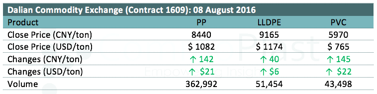 Contract number 1609 on Dalian Commodity Exchange on 08 August 2016 settled as following: