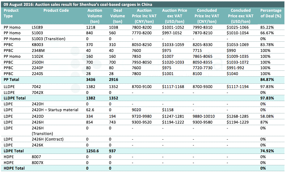 Auctions sales result for Shenhua’s coal-based polyolefin products in domestic China are as following: