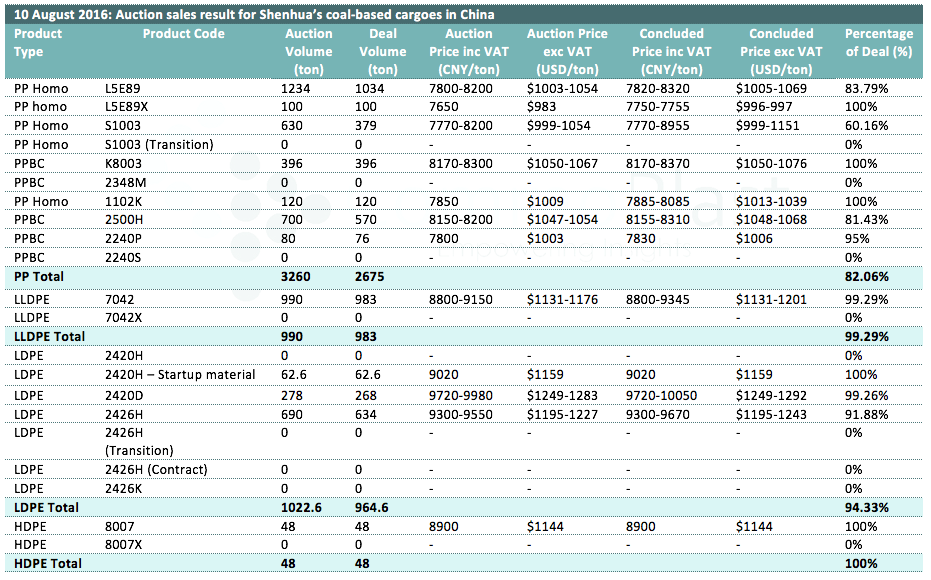 Auctions sales result for Shenhua’s coal-based polyolefin products in domestic China are as following: