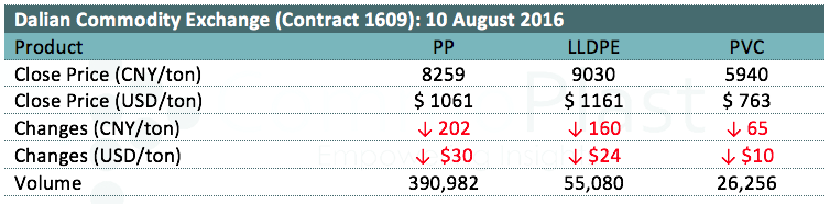 Contract number 1609 on Dalian Commodity Exchange on 10 August 2016 settled as following: