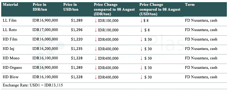One of the major Indonesia producers has reduced the offers for PE today in domestic market with a decrease of IDR100,000/t ($8/t) for LLDPE and IDR400,000/t ($30/t) for HDPE compared to last week.