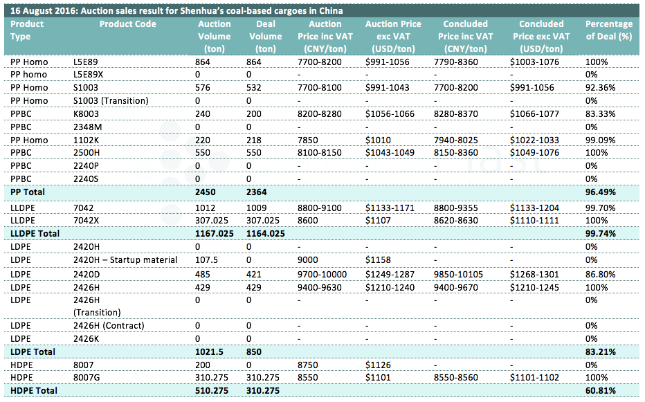 16 August 2016: Auction sales result for Shenhua's coal-based cargoes in China