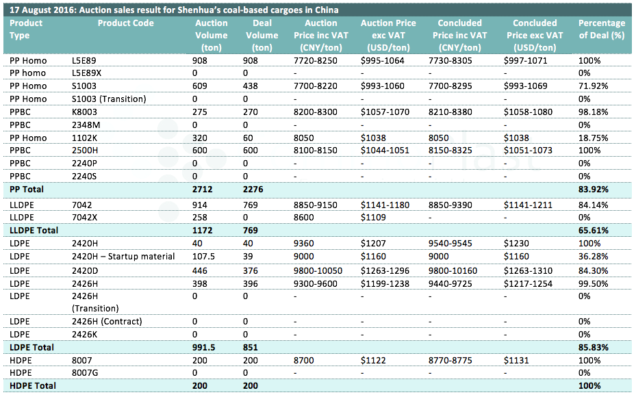 17 August 2016: Auction sales result for Shenhua's coal-based cargoes in China
