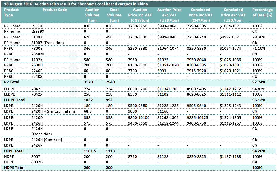 18 August 2016: Auction sales result for Shenhua's coal-based cargoes in China