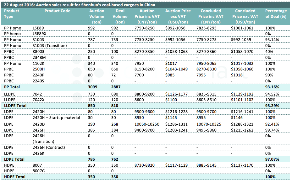 22 August 2016: Auction sales result for Shenhua's coal-based cargoes in China