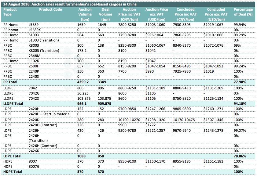 Auctions sales result for Shenhua’s coal-based polyolefin products in domestic China are as following:
