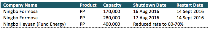 Accordingly, the two PP plants affected are Ningbo Formosa and Ningbo Heyuan (Fund Energy) with detailed information shows in following table. The compulsory shutdown period is from 26 August – 6 September 2016.