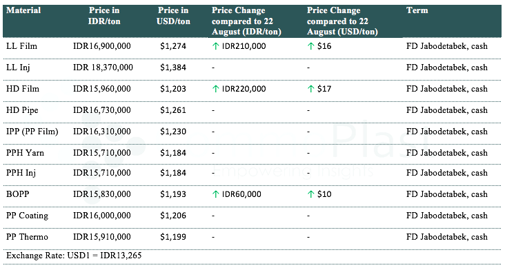 A major maker in Indonesia has announced new offers for beginning of the week with an increased of IDR210,000/ton ($16/ton) for LLDPE film, IDR220,000/ton ($17/ton) for HDPE film and IDR60,000/ton ($10/ton) for BOPP, maintaining offers for other grades as compared to last week.