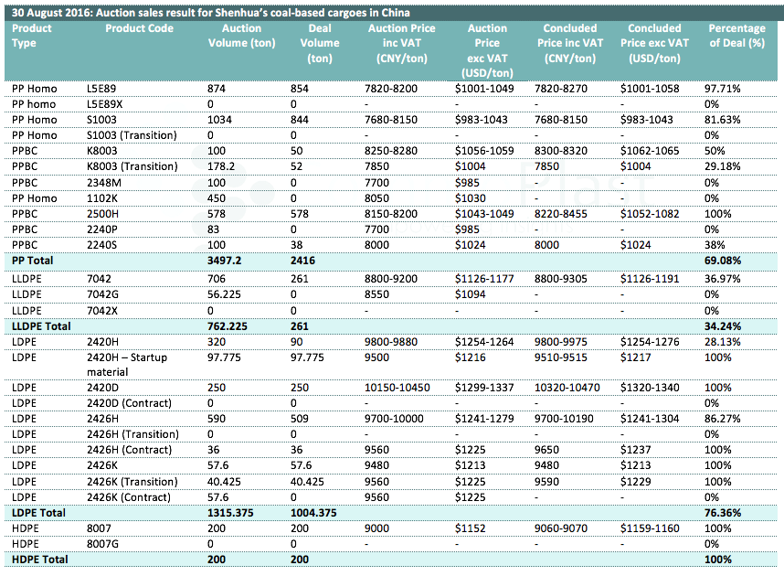 30 August 2016: Auction sales result for Shenhua's coal-based cargoes in China