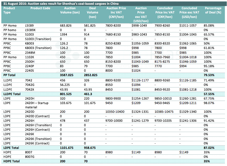 31 August 2016: Auction sales result for Shenhua's coal-based cargoes in China