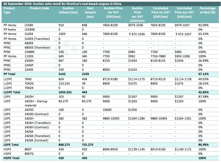 02 September 2016: Auction sales result for Shenhua's coal-based cargoes in China