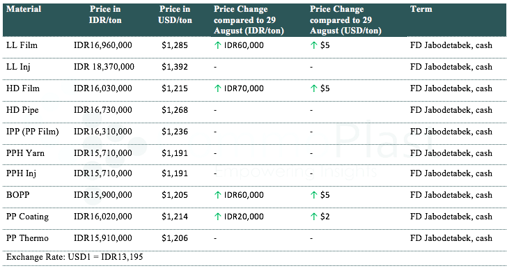 A major maker in Indonesia has announced new offers for beginning of the week with an increased of IDR60,000/ton ($5/ton) for LLDPE film and BOPP, IDR70,000/ton ($5/ton) for HDPE film and IDR20,000/ton ($2/ton) for homo-PP coating, maintaining offers for other grades as compared to last week.