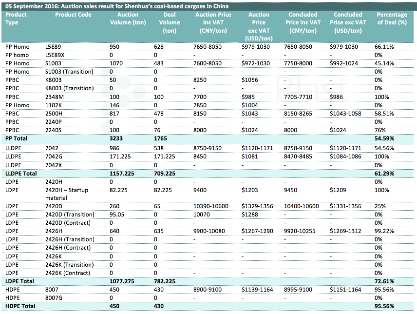05 September 2016: Auction sales result for Shenhua's coal-based cargoes in China