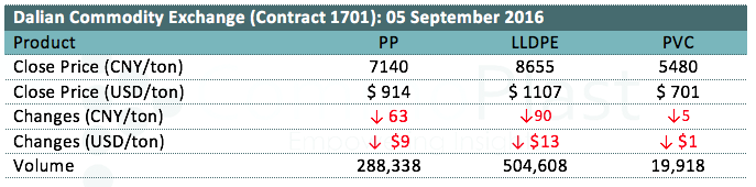 Dalian Commodity Exchange: 05 September 2016