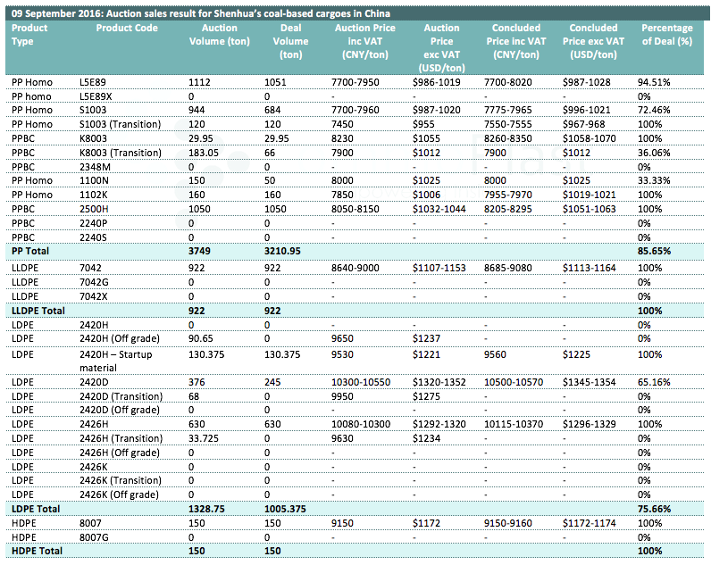 09 September 2016: Auction sales result for Shenhua's coal-based cargoes in China