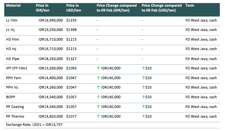 According to regional market players, one of the Indonesian major makers implemented price hike for its PP offers for the second time this week in domestic market compared to the last offer given on yesterday, 9 February 2016 while leaving PE prices stable. Players attributed this price increased to the tight PP supply in the market.