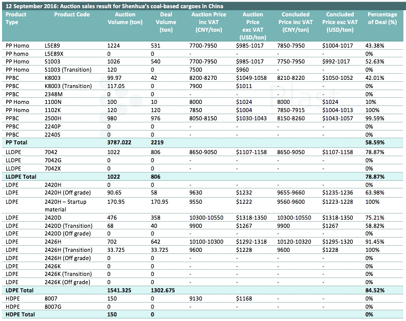 12 September 2016: Auction sales result for Shenhua's coal-based cargoes in China