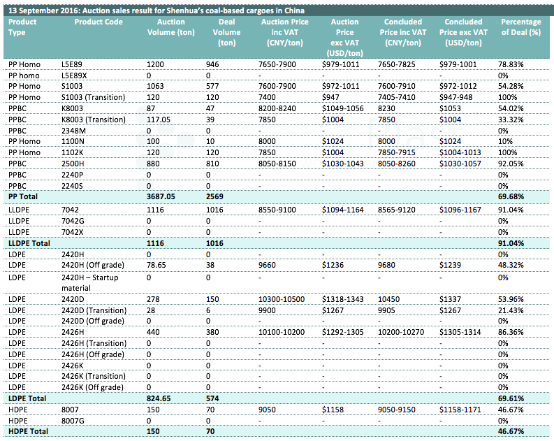 Auctions sales result for Shenhua’s coal-based polyolefin products in domestic China are as following: