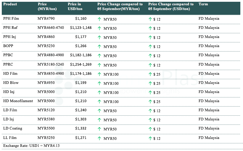 A major producer from Malaysia has implemented second price adjustment in a month for both PP and PE in domestic market with an increase of MYR50/ton ($12/ton) as compared to their latest adjustment since beginning of the month. Players attributed the price hike to recent weaker currency parity.