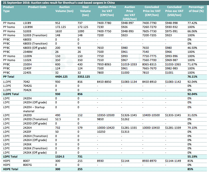 21 September 2016: Auction sales result for Shenhua's coal-based cargoes in China