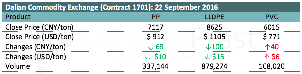 Contract number 1701 on Dalian Commodity Exchange on 22 September 2016 settled as following: