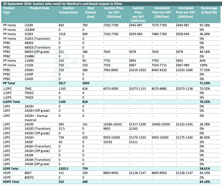 23 September 2016: Auction sales result for Shenhua's coal-based cargoes in China