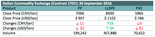 Contract number 1701 on Dalian Commodity Exchange on 26 September 2016 settled as following: