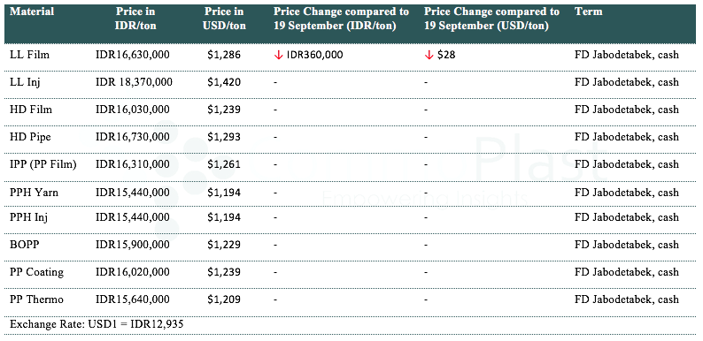 A major maker in Indonesia has announced new offers for beginning of the week for local market with decreased of IDR360,000/ton ($28/ton) for LLDPE film, maintaining other offers stable as compared to their latest offers on 19 September 2016.