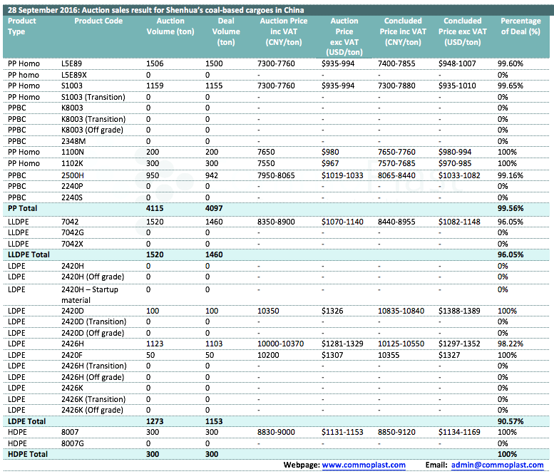 Auctions sales result for Shenhua’s coal-based polyolefin products in domestic China are as following:
