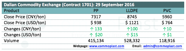 Contract number 1701 on Dalian Commodity Exchange on 29 September 2016 settled as following: