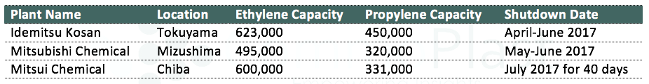 According to market sources, there are 3 out of 12 steam crackers in Japan are planning to shut for maintenance by next year as shown in the following table: