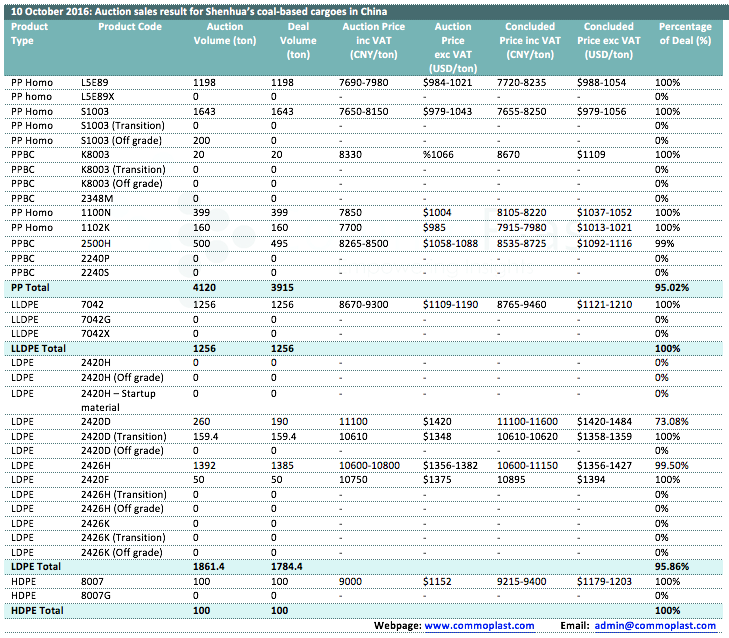 Auctions sales result for Shenhua’s coal-based polyolefin products in domestic China are as following: