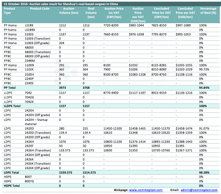 11 October 2016: Auction sales result for Shenhua's coal-based cargoes in China