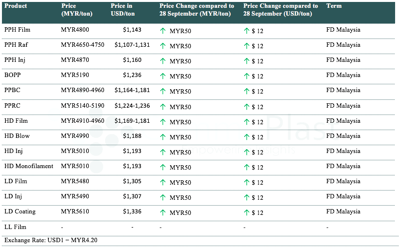 A major producer from Malaysia has implemented further price hike for domestic market today with an increased of MYR50/ton ($12/ton) for all grades of PP and PE due to recent depreciation of currency.