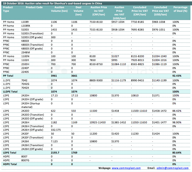 Auctions sales result for Shenhua’s coal-based polyolefin products in domestic China are as following: